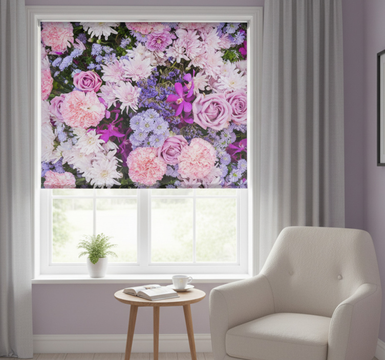 Ροζ ρολό κουρτίνας με πολύχρωμα λουλούδια