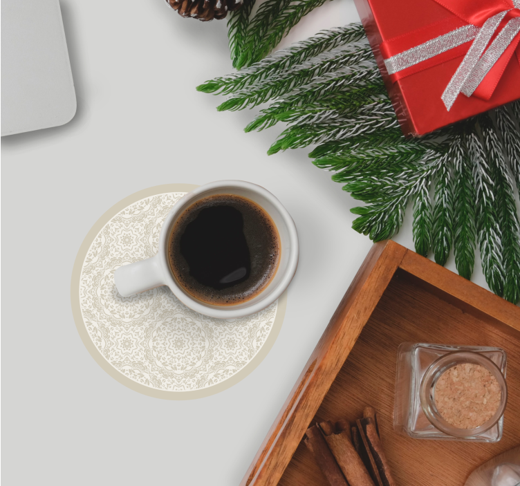 Ανακαλύψτε την ομορφιά του Σουβέρ με Πολύπλοκο Σχέδιο Στρογγυλής Επιφάνειας, το οποίο συνδυάζει μπεζ αποχρώσεις με στολίδια και διακοσμητικά στοιχεία που απεικονίζουν έναν κλασσικό μάνταλα σχεδιασμό. Το πρότυπο του είναι λεπτό και η υφή του ελκυστική, με εγκύκλιο μορφή που προσδίδει μία αίσθηση συμμετρίας και κομψότητας. Σε ουδέτερους τόνους, αυτό το στολισμένο σουβέρ είναι ιδανικό για κάθε διακόσμηση!