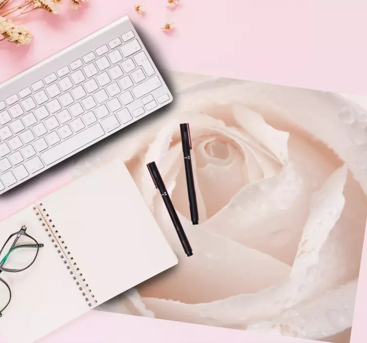 Ανακαλύψτε το Πρωτότυπο χαλάκι ποντικιού Λεπτομερής ανθοκομική εικόνα, που συνδυάζει την κομψότητα με την φυσική ομορφιά! Το γραφικό σχέδιο περιλαμβάνει τριαντάφυλλα σε άσπρο χρώμα, με καθαρή εμφάνιση, φράζοντας πέταλα και νερό, με σταγόνες βροχής που προσθέτουν μία αίσθηση κομψότητας. Αυτή η φωτογραφία της φύσης προσφέρει μία μαλακή υφή και κομψότητα που θα αναδείξουν τον χώρο σας!