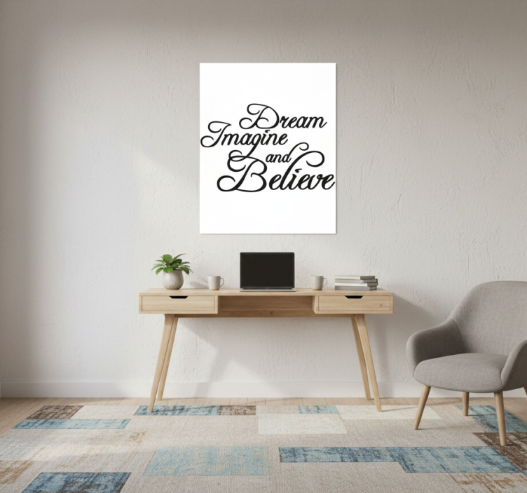 Η Aφίσα για το γραφείο Aφίσα για το γραφείο ονειρέψου φαντάσου πίστεψε είναι η ιδανική επιλογή για να διακοσμήσετε τον χώρο σας! Με την ικανότητά της να εμπνέει και να ενθουσιάζει, προσφέρει μια αίσθηση ελπίδας και θετικής ενέργειας. Είναι ο τέλειος σύντροφος για κάθε επαγγελματία που θέλει να ενισχύσει την παραγωγικότητά του και να δημιουργήσει έναν πιο ευχάριστο και δημιουργικό χώρο εργασίας!