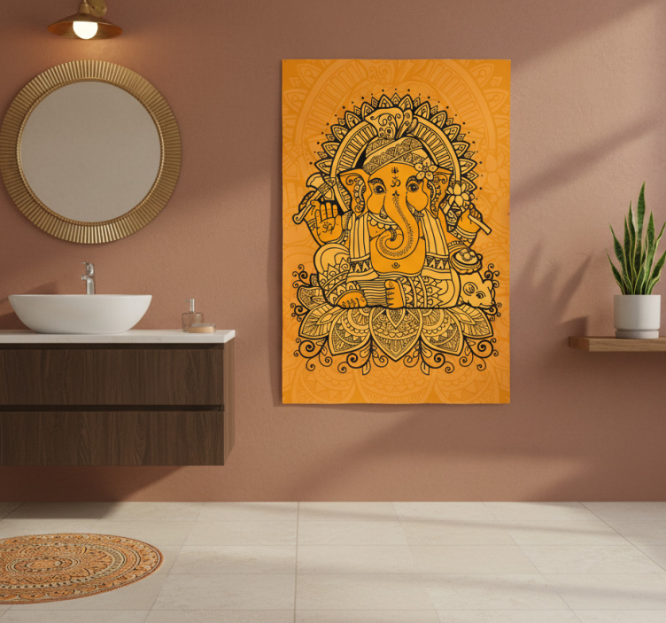 Αναφορά: G1082Αυτή η ζωντανή εικόνα παρουσιάζει μια περίπλοκη απεικόνιση του Lord Ganesha, πλαισιωμένη από ένα ζεστό πορτοκαλί φόντο. Είναι στολισμένος με διακοσμητικά στοιχεία, κρατώντας διάφορα συμβολικά αντικείμενα, που μεταφέρουν σοφία και ευημερία. Ένα πλούσιο φυτό και κομψή διακόσμηση μπάνιου συμπληρώνουν το έργο τέχνης, δημιουργώντας μια αρμονική και ήρεμη ατμόσφαιρα.
