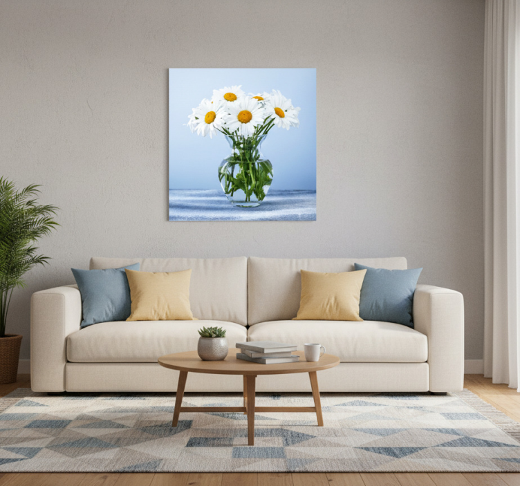 Η Aφίσα για το σαλόνι Λουλούδια μαργαρίτες σε γυάλινα δοχεία είναι η ιδανική επιλογή για να προσθέσετε ζωντάνια και χρώμα στο σαλόνι σας! Φέρνει τη φύση μέσα στο σπίτι σας, δημιουργώντας μια ατμόσφαιρα ηρεμίας και ομορφιάς. Είναι ο τέλειος τρόπος να εκφράσετε την προσωπικότητά σας και να κάνετε τον χώρο σας πιο φιλόξενο και ζεστό. Είτε πρόκειται για ένα σύγχρονο είτε για ένα κλασικό σαλόνι, αυτή η αφίσα θα ενισχύσει τη γενική αισθητική του χώρου σας!