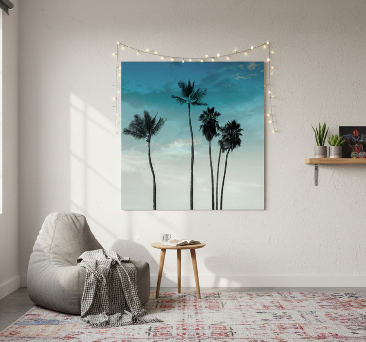 Η εικόνα απεικονίζει κομψές φοίνικες σε σιλουέτα ενάντια σε έναν ήρεμο ουρανό, συνδυάζοντας δροσερές μπλε και ανοιχτό γκρι αποχρώσεις. Διακριτές υφές ενισχύουν την ήρεμη ατμόσφαιρα, ενώ ο απαλός φωτισμός από τα φωτάκια προσθέτει μια ζεστή αίσθηση. Αυτό το έργο τέχνης ενσωματώνει μια ηρεμιστική, τροπική ατμόσφαιρα, ιδανική για την αναβάθμιση εσωτερικών χώρων.