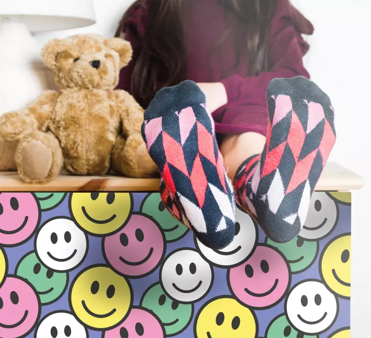 Ανακαλύψτε το Αυτοκόλλητο με ζώα σε πολύχρωμα σχέδια χαμόγελου, ένα μοναδικό σχέδιο που συνδυάζει έπιπλα με χαμογελαστά πρόσωπα σε παστέλ χρώματα. Αυτή η διακόσμηση είναι χαρούμενη, παιχνιδιάρικη και ζωηρή, προσφέροντας μια αίσθηση διασκέδασης σε κάθε χώρο. Ιδανικό για παιδικά δωμάτια ή χώρους που χρειάζονται μια δόση χρώματος!