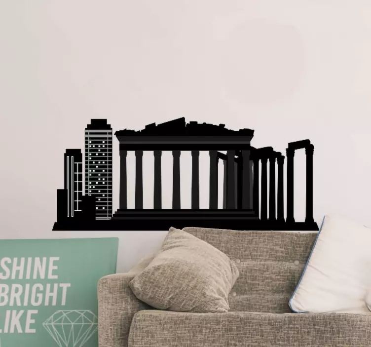 Αναβαθμίστε τη διακόσμηση του χώρου σας με αυτό το αυτοκόλλητο σιλουέτα των Αθηνών. Απεικονίζει έναν ψηλό ουρανοξύστη και ένα μεγάλο συμβολικό μνημείο, που δημιουργεί μια εντυπωσιακή εικόνα.