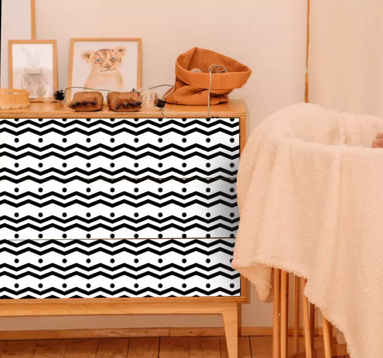 Προσθέστε μια μοναδική πινελιά στον χώρο σας με αυτό το ασπρόμαυρο αυτοκόλλητο ζιγκ-ζαγκ για επίπλωση. Απολαύστε την καταπληκτική εφαρμογή του στα έπιπλα σας για όσο χρονικό διάστημα επιθυμείτε. Αυτό το διακοσμητικό αυτοκόλλητο επίπλων όχι μόνο δίνει στυλ, αλλά προστατεύει επίσης τα έπιπλά σας από γρατζουνιές και λεκέδες. Η εφαρμογή είναι εύκολη και γίνεται με τη χρήση μιας σπάτουλας, και μπορείτε εύκολα να το αφαιρέσετε όταν επιθυμείτε. Ανακαλύψτε και άλλα φανταστικά στυλ διακόσμησης επίπλων στον ιστότοπό μας που θα σας ενθουσιάσουν επίσης.