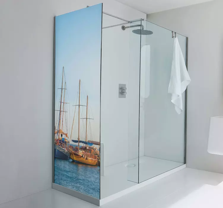 The design depicts a dock with multiple boats. It will significantly enhance the appearance of your bathroom space, and the application is so simple. It is long-lasting, does not fade or peel over time, and you can wash or clean the surface as needed without any problem. Adjust the dimension that fits your door space in the measurement field, and it will be made to order for you.
