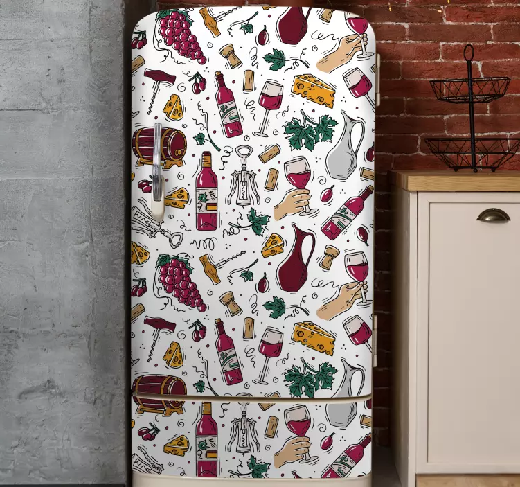 Αυτό το υπέροχο διακοσμητικό αυτοκόλλητο πόρτας ψυγείου θα ανανεώσει τον χώρο σας. Ο σχεδιασμός του περιλαμβάνει διάφορα κρασιά, φρούτα και άλλες εικόνες, προσθέτοντας μια φρέσκια ατμόσφαιρα στην κουζίνα σας.