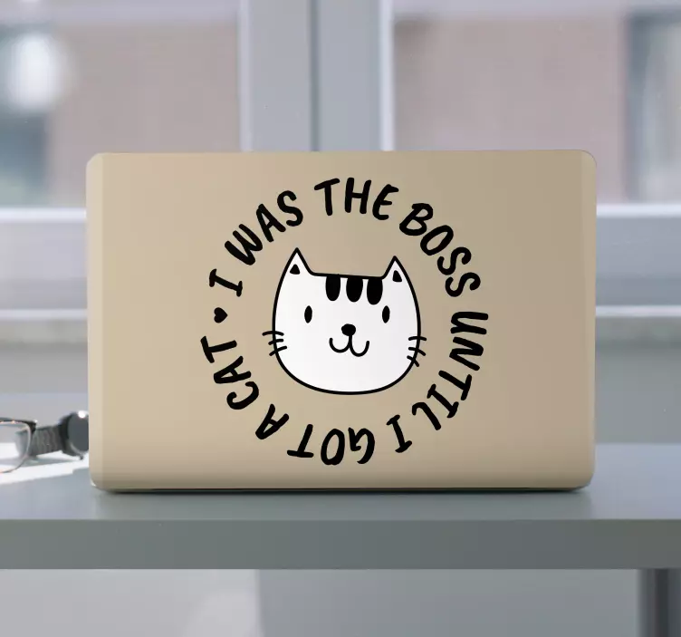 Αυτό το διακοσμητικό αυτοκόλλητο βινυλίου φορητού υπολογιστή είναι για τους λάτρεις των γατών. Είναι εύκολο να εφαρμοστεί αυτοκόλλητο φορητού υπολογιστή λόγω του καλής ποιότητας υλικού από. Ο σχεδιασμός του απεικονίζει ένα πρόσωπο γάτας σε μπεζ φόντο με κείμενο σε στυλ κύκλου που γράφει "ήμουν αφεντικό μέχρι να αποκτήσω μια γάτα". Το προϊόν είναι φτιαγμένο από βινύλιο και είναι το καλύτερο στην αγορά, δεν τσαλακώνει ή δημιουργεί φούσκα όταν εφαρμόζεται.