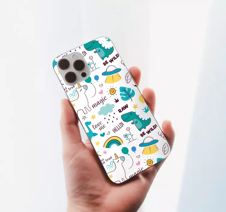 Ανακαλύψτε το Αυτοκόλλητο iphone με μοτίβα φανταστικών πλασμάτων, ένα μοναδικό σχέδιο που συνδυάζει δεινόσαυρους, μονόκερους, και μαγεία σε μια χαριτωμένη και πολύχρωμη διάταξη. Το σχέδιο αυτό είναι γεμάτο φαντασία και προσφέρει μια μαγευτική αίσθηση στο τηλέφωνό σας, μετατρέποντάς το σε ένα έργο τέχνης που αποπνέει χαρά και δημιουργικότητα!