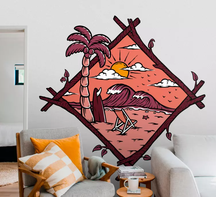 Ανακαλύψτε την ομορφιά της φύσης με το Αυτοκόλλητο με τη φύση Σκηνή Τροπικής Παραλίας. Το σχέδιο απεικονίζει μια μοναχική παραλία με έναν σέρφερ που απολαμβάνει τα κυματιστά κύματα, ενώ η δυση του ηλίου ρίχνει μαγευτικά χρώματα στον ουρανό. Οι φοίνικες και η καρέκλα θαλάσσης προσθέτουν μια αίσθηση χαλάρωσης, ενώ τα βουνά στο βάθος ολοκληρώνουν την τροπική ατμόσφαιρα!