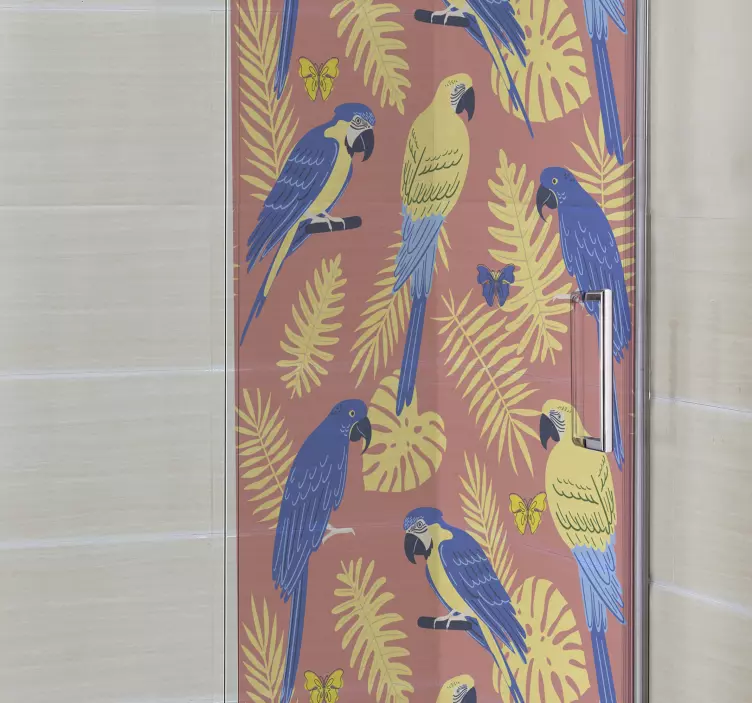 Αυτό το όμορφο αυτοκόλλητο διαθέτει μια μοναδική εικονογράφηση με παπαγάλους και πεταλούδες πάνω σε τροπικά φύλλα. Είναι ένα προϊόν από ποιοτικό βινύλιο, σχεδιασμένο για να προσθέσει μια διακοσμητική πινελιά στην πόρτα του ντους στο μπάνιο σας.