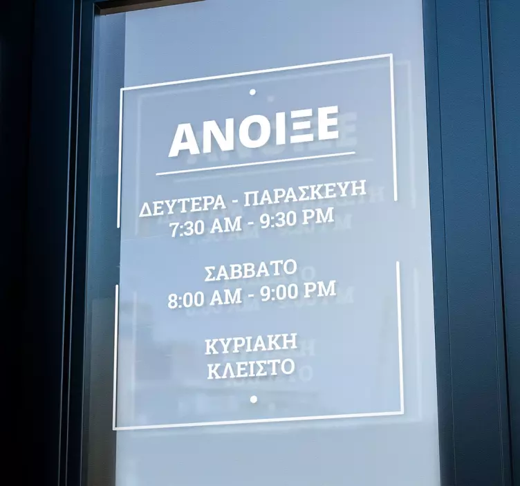 Το αυτοκόλλητο πρόσοψης καταστήματος ώρες λειτουργίας είναι η ιδανική επιλογή για τη διακόσμηση κάθε επιχείρησης! Δίνει έναν αέρα εξατομίκευσης και ένα μοναδικό στυλ που θα κάνει το κατάστημά σας να ξεχωρίζει!