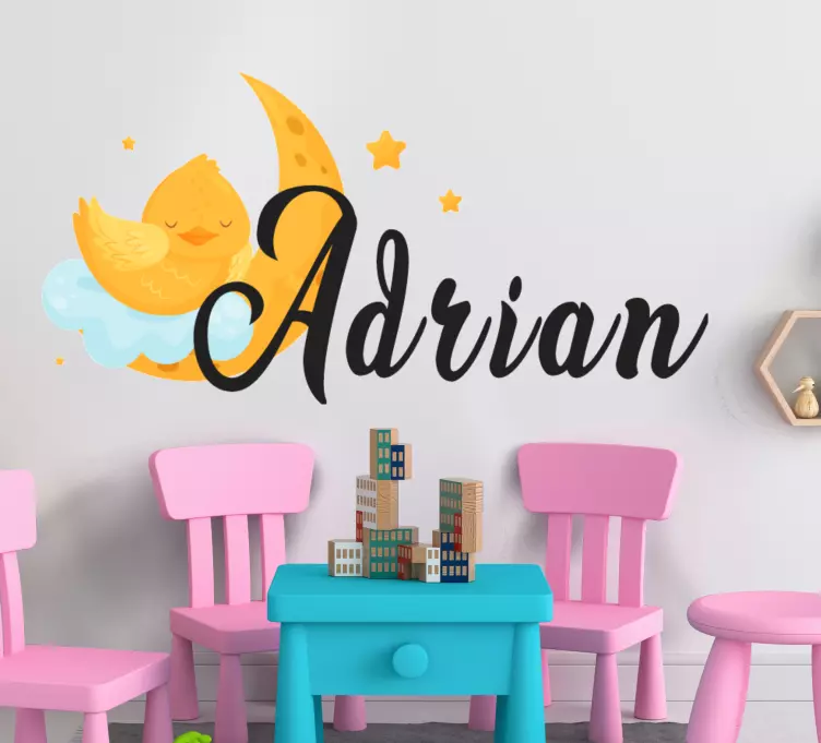 Ανακαλύψτε το αυτοκόλλητο για παιδιά με σχέδιο χαριτωμένου φεγγαριού, που συνδυάζει την απεικόνιση ενός γλυκού νεοσσού και ενός φεγγαριού γεμάτου αστέρια και σύννεφα. Αυτό το εξατομικεύσιμο αυτοκόλλητο προσφέρει τη δυνατότητα να προσθέσετε το όνομα του παιδιού σας, κάνοντάς το ιδανικό για το παιδικό δωμάτιο σας. Είναι μια όμορφη και ζεστή προσθήκη που θα φωτίσει κάθε γωνιά του χώρου, καθιστώντας τον πιο φιλόξενο και χαρούμενο!