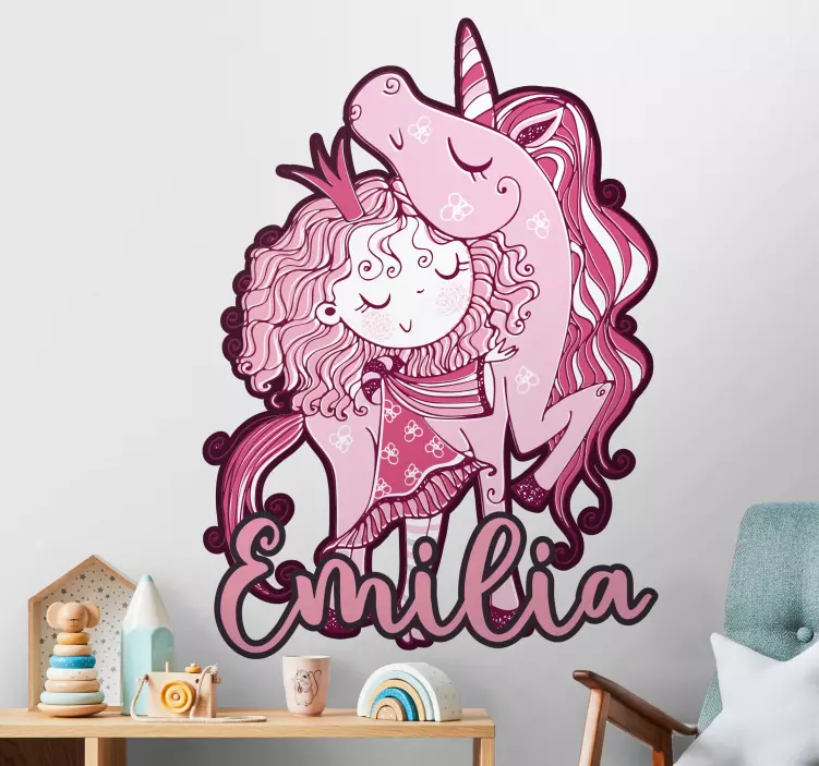 Ανακαλύψτε το Αυτοκόλλητο για παιδιά Ροζ Μονόκερος Αγκαλιά, ένα μαγευτικό σχέδιο που συνδυάζει την φαντασία και την πριγκίπισσα αίσθηση. Αυτό το κινούμενο σχέδιο με τον μονόκερο και το όνομα του παιδιού σας είναι ιδανικό για κάθε κορίτσι που αγαπά τις φαντασιόπληκτες περιπέτειες. Είναι προσαρμόσιμο και φέρνει την μαγεία στην καθημερινότητα των παιδιών!