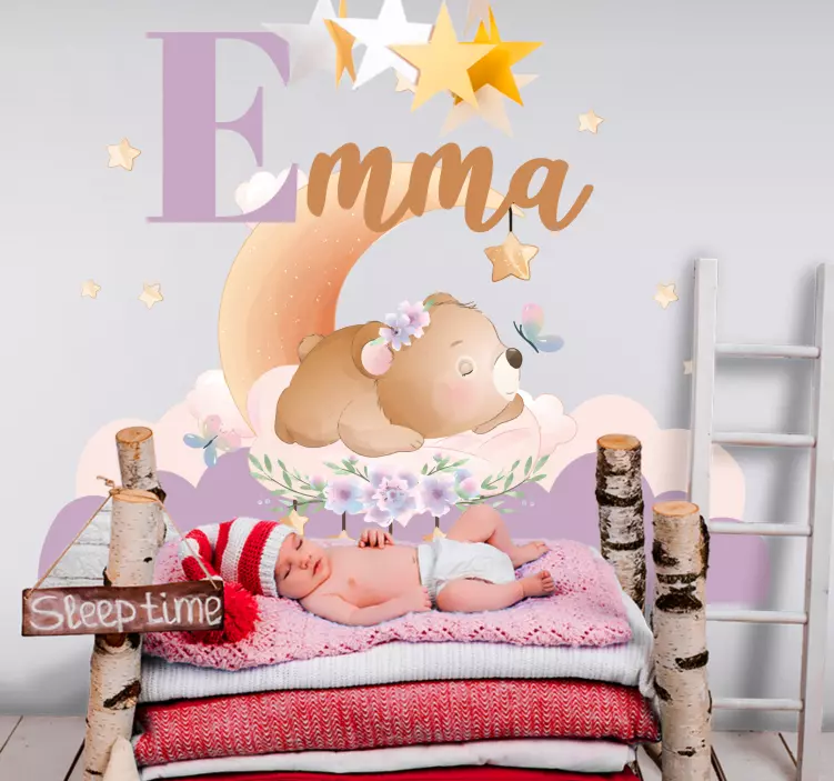 Αναφορά: A52394Μια γοητευτική απεικόνιση που απεικονίζει μια κοιμισμένη αρκούδα που είναι φωλιασμένη ανάμεσα σε σύννεφα και αστέρια. Ο σχεδιασμός περιλαμβάνει παστέλ χρώματα, ανθισμένα στοιχεία και εξατομικευμένα στοιχεία, ιδανικά για τον χώρο ενός παιδιού. Το ήρεμο θέμα προάγει την ηρεμία, κάνοντάς το τέλειο για βρεφονηπιακούς σταθμούς ή παιδικά δωμάτια.
