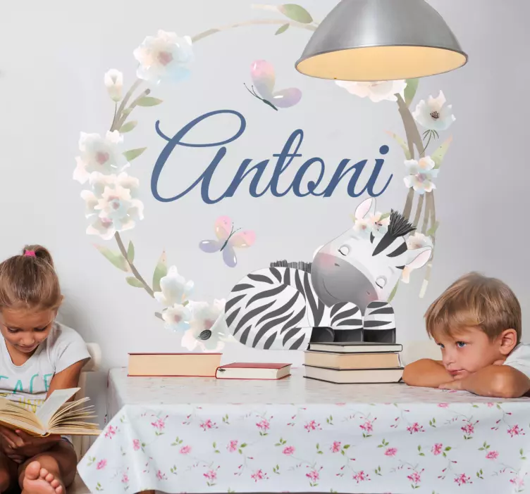 Ανακαλύψτε το Αυτοκόλλητο για παιδιά Ζωγραφική Ζέβρας με Λουλούδια, ένα χαριτωμένο σχέδιο που συνδυάζει την προσαρμοστικότητα με την παιχνιδιάρικη διάθεση. Αυτή η ζέβρα, στολισμένη με λουλούδια, προσφέρει μια φαντασιόπληκτη αίσθηση σε οποιοδήποτε παιδικό δωμάτιο. Το όνομα μπορεί να προσαρμοστεί με καλλιγραφία, προσδίδοντας μια προσωπική πινελιά που θα ενθουσιάσει τα παιδιά!