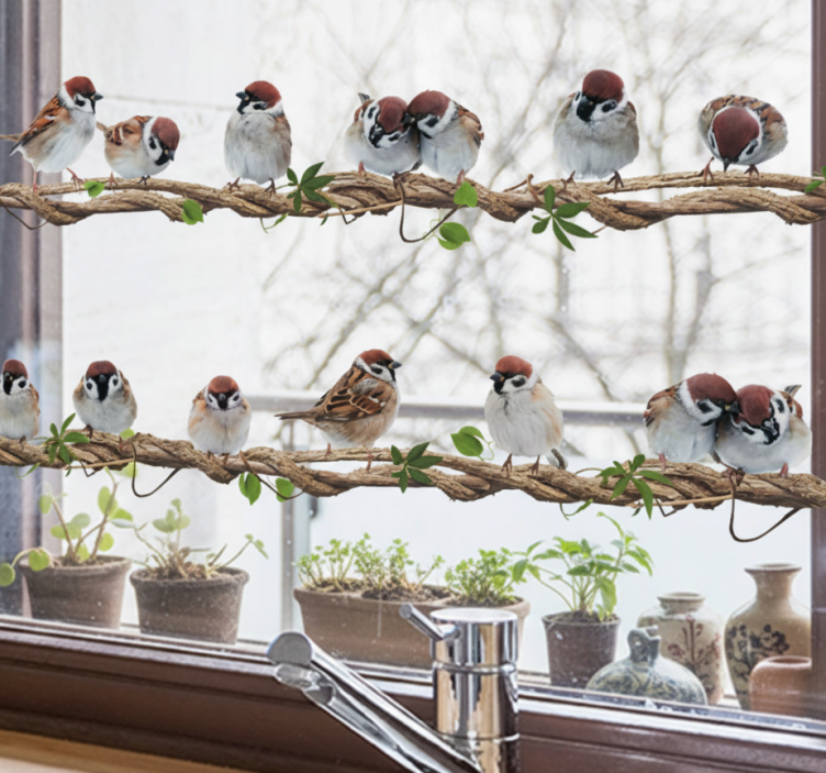 Αυτοκόλλητα Παράθυρα σπουργίτια σε κλαδιά