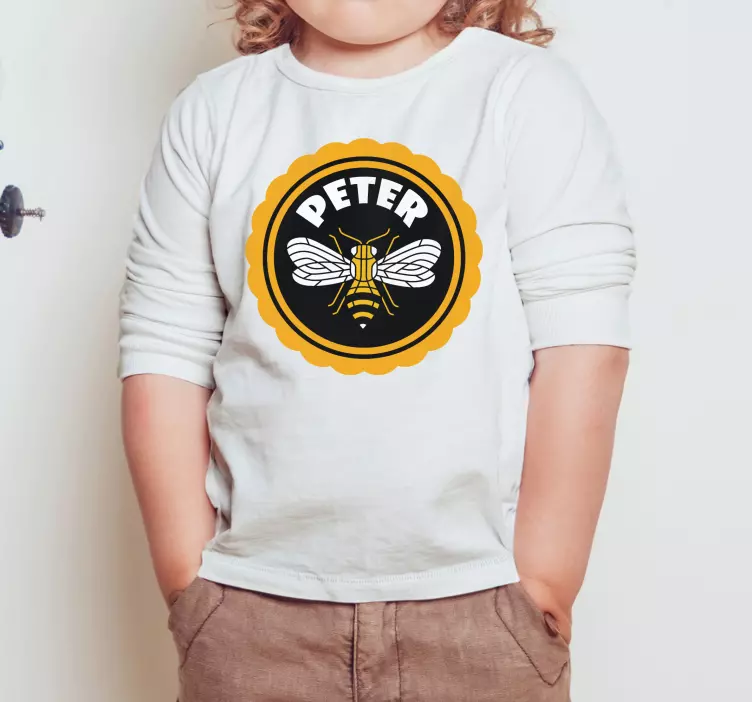 Αναφορά: T4984Αυτός ο γοητευτικός σχεδιασμός διαθέτει μια ζωντανή απεικόνιση μέλισσας περιτριγυρισμένη από μια έντονη κίτρινη κοφτή μπορντούρα. Το όνομα 'Peter' που εμφανίζεται prominently προσθέτει μια προσωπική πινελιά, κάνοντάς το ιδανικό για παιδιά. Ο συνδυασμός παιχνιδιάρικων χρωμάτων και ενός ελκυστικού μοτίβου δημιουργεί μια ελκυστική εμφάνιση για παιδικά ρούχα.
