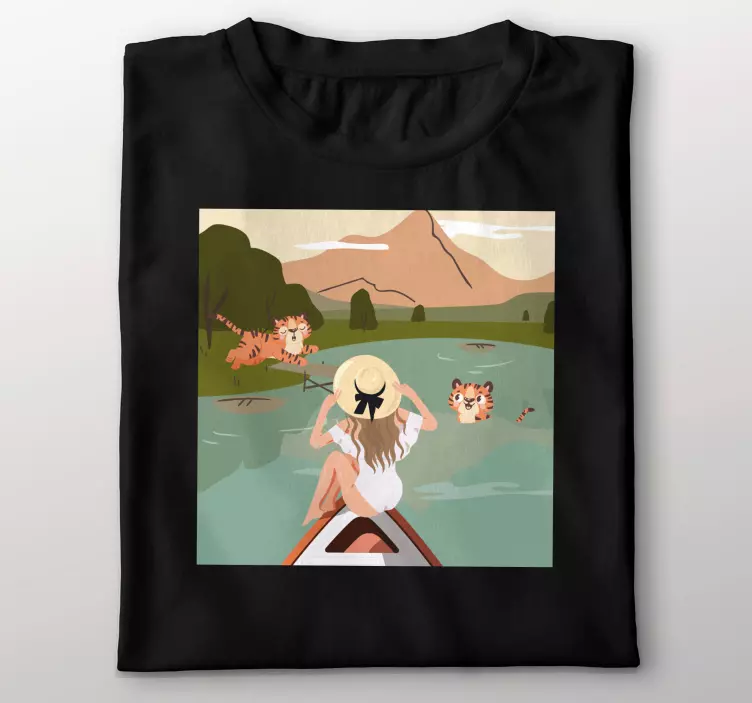 Ανακαλύψτε την μαγεία της φύσης με το Μπλουζάκι Περιπέτεια με Τίγρεις. Το γραφικό σχέδιο απεικονίζει ένα κορίτσι που απολαμβάνει το τοπίο δίπλα σε τίγρεις, σε μια εκπληκτική λίμνη γεμάτη νερό. Αυτό το κινουμενο σχέδιο συνδυάζει την ομορφιά των ζώων με την ηρεμία της φύσης, προσφέροντας μια μοναδική αίσθηση χαλάρωσης και εξωτερικού χώρου. Φορέστε το και νιώστε την περιπέτεια!