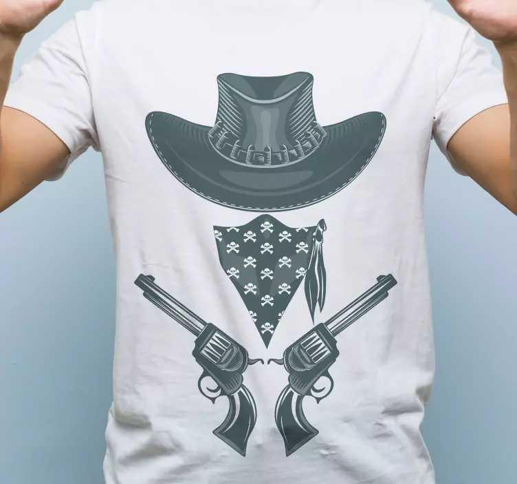Ανακαλύψτε το μοναδικό Μπλουζάκι Καπέλο Καουμπόι και Όπλα, που συνδυάζει με μαεστρία την απεικόνιση του καουμπόη με τα όπλα και το καπέλο του, δημιουργώντας μια ατμόσφαιρα εκτός νόμου. Το σχέδιο αυτού του μπλουζακιού αποπνέει τον δυτικό χαρακτήρα με στοιχεία όπως το φουλάρι και το περίστροφο, ιδανικό για πειρατές και λάτρεις της ενδυμασίας.
