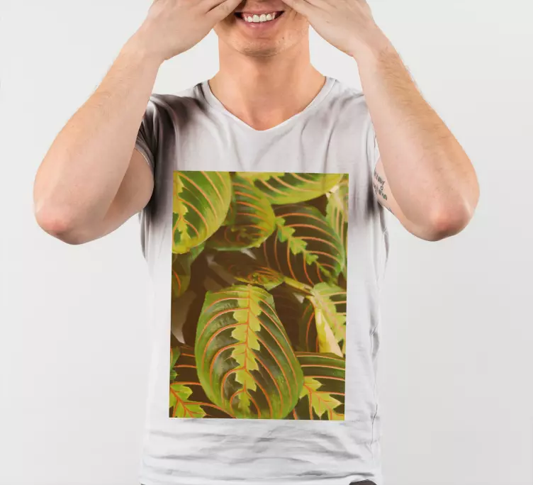 Το Μπλουζάκι με μοτίβο πράσινου φύλλου είναι μια εξαιρετική επιλογή για όσους αγαπούν τη φύση! Με γραφικό σχέδιο που περιλαμβάνει μαράντα, φύλλα, και τροπικά στοιχεία, αυτό το μπλουζάκι προσφέρει μια μοναδική βοτανική απεικόνιση που θυμίζει ζούγκλα. Οι φρέσκες και ζωηρές αποχρώσεις του πράσινου δημιουργούν μια εξωτική ατμόσφαιρα, ιδανική για κάθε περίσταση. Η υφή του είναι ευχάριστη και άνετη, κάνοντάς το το τέλειο ρούχο για να απολαύσετε τη ζωή!
