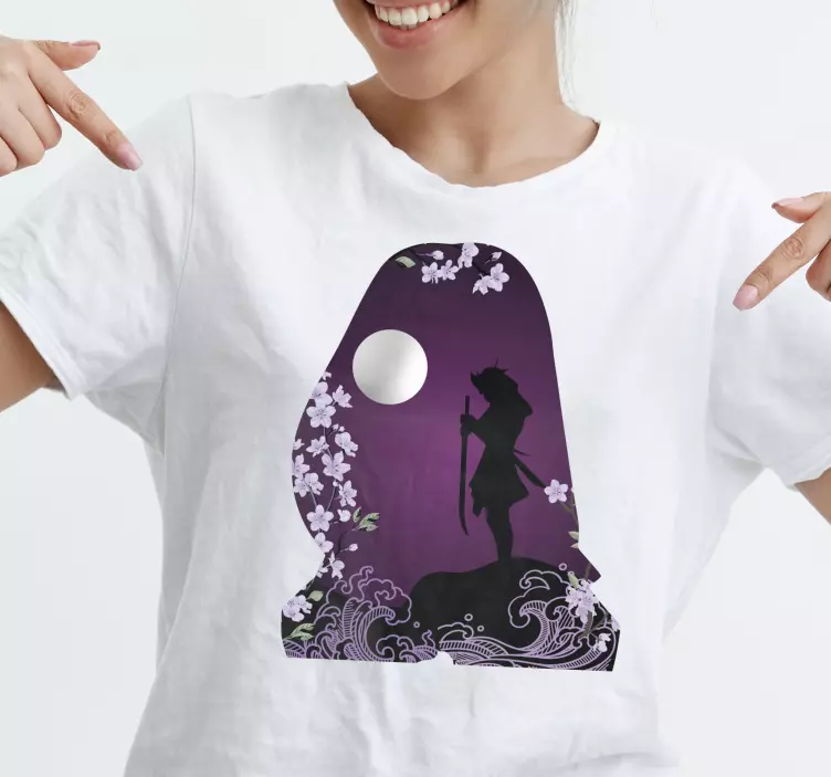 Ανακαλύψτε την ομορφιά της φύσης με το Μπλουζάκι Σιλουέτα με Ανθισμένες Κερασιές. Το γραφικό του σχέδιο συνδυάζει φαντασία με ιαπωνική τέχνη, απεικονίζοντας λουλούδια σε βιολέτα και μωβ αποχρώσεις, με φεγγάρι και έναν πολεμιστή που προσθέτει μια άνοιξη κομψότητας. Κάθε λεπτομέρεια του σχεδίου σας μεταφέρει σε έναν κόσμο γεμάτο άνθη και αισθητική.