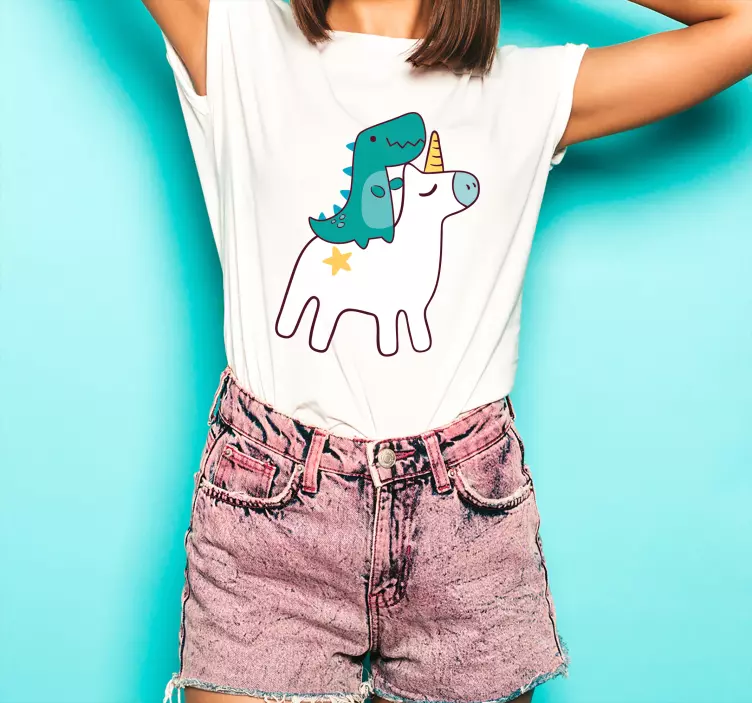 Αναφορά: T5138Αυτός ο γοητευτικός σχεδιασμός παρουσιάζει μια φανταστική σκηνή με έναν unicorn σε συνδυασμό με έναν δεινόσαυρο, δημιουργώντας μια διασκεδαστική και παιχνιδιάρικη ατμόσφαιρα. Ζωντανά χρώματα και χαριτωμένα σχήματα ενισχύουν το παιχνιδιάρικο θέμα, κάνοντάς το ιδανικό για casual wear.