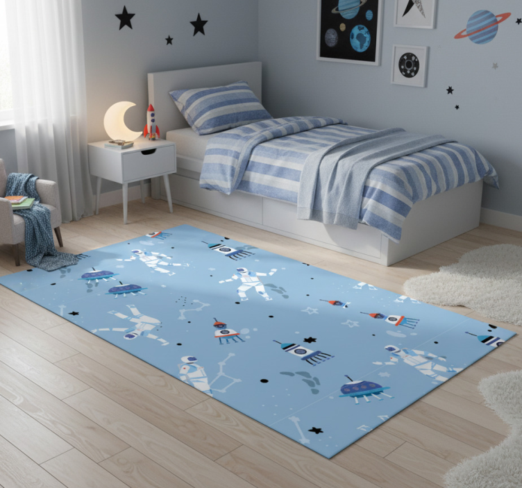 Το χαλί κρεβατοκάμαρας με αστροναύτες και διαστημόπλοια δεν είναι απλώς ένα διακοσμητικό στοιχείο, αλλά μια πηγή έμπνευσης για μικρούς και μεγάλους! Ενισχύει τη φαντασία και δημιουργεί μια μαγευτική ατμόσφαιρα στο υπνοδωμάτιό σας. Είναι ιδανικό για να προσθέσετε μια παιχνιδιάρικη διάθεση και να μετατρέψετε το χώρο σας σε ένα μοναδικό ηλιακό σύστημα γεμάτο περιπέτειες!