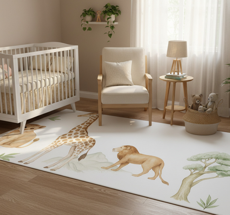 Αναφορά: R24039Ένας παιχνιδιάρικος σχεδιασμός περιλαμβάνει μια καμηλοπάρδαλη, ένα λιοντάρι και ένα λιονταράκι, που έχουν εικονογραφηθεί με λεπτομέρεια σε απαλές, γήινες αποχρώσεις. Στοιχεία της φύσης, όπως φυλλώδεις λεπτομέρειες και βραχώδεις σχηματισμοί, συμπληρώνουν τα ζώα, ενισχύοντας τη συνολική γοητεία της σύνθεσης. Η στυλιζαρισμένη εικόνα αποπνέει μια αίσθηση ζεστασιάς και δημιουργικότητας.