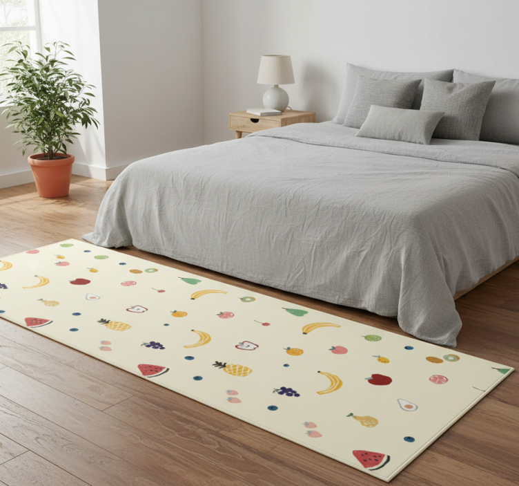Το χαλί κρεβατοκάμαρας Χαλί κρεβατοκάμαρας με χρωματιστά μικρά φρούτα είναι η τέλεια επιλογή για να αναδείξετε τη διακόσμηση του χώρου σας! Οι ζωντανές και πολύχρωμες λεπτομέρειες του προσελκύουν το βλέμμα και δημιουργούν μια ευχάριστη ατμόσφαιρα. Αφήστε το να γίνει το κεντρικό κομμάτι του δωματίου σας, προσφέροντας μια μοναδική αίσθηση φρεσκάδας και ζωής. Είναι ιδανικό για να συμπληρώσει οποιοδήποτε στυλ διακόσμησης, από κλασικό μέχρι μοντέρνο!