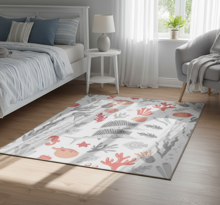 Το χαλί κρεβατοκάμαρας με απεικόνιση θαλάσσιας ζωής είναι η τέλεια επιλογή για να αναδείξετε τη διακόσμηση του σπιτιού σας! Με το φρέσκο και ζωντανό του σχέδιο, θα δημιουργήσει μια ατμόσφαιρα ευχάριστης και αναζωογονητικής ενέργειας στον χώρο σας. Η τέχνη του θαλάσσιου κόσμου θα σας ταξιδέψει και θα σας εμπνεύσει καθημερινά! Αφήστε την ομορφιά της φύσης να εισέλθει στον προσωπικό σας χώρο!