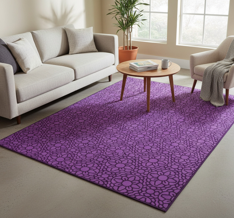 Ο καθαρισμός του γεωμετρικού χαλιού Χαλί γεωμετρικού σχεδιασμού με μωβ κυκλικά λουλούδια είναι απλός και γρήγορος! Μπορείτε να το σκουπίσετε με ένα υγρό πανί ή να χρησιμοποιήσετε μια ηλεκτρική σκούπα για να διατηρήσετε την καθαριότητά του. Η αντοχή του στις καθημερινές φθορές το καθιστά ιδανικό για κάθε σπίτι.