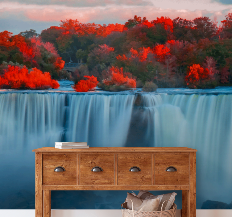 Απολαύστε τη λεπτομερή απεικόνιση ενός φθινοπωρινού δάσους με καταρράκτη, που προσθέτει χρώμα και ζωντάνια στον χώρο σας. Το σχέδιο περιλαμβάνει έναν θάμνο με κόκκινα λουλούδια και μια πεταλούδα, προσδίδοντας μια γλυκιά αίσθηση φύσης και ευεξίας.